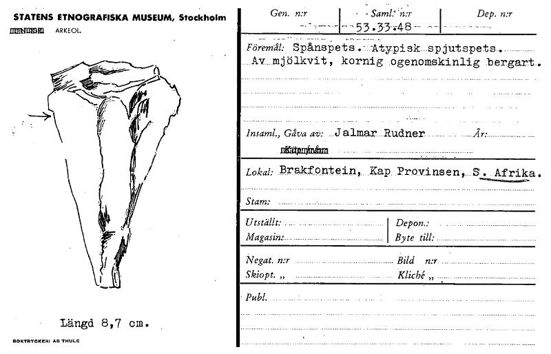 STATENS ETNOGRAFISKA MUSEUM, Stockholm ntmumn ARKEOL. - - 53 - Gen. n:r Dep. n:r År: lnsaml., Gåva av: ...Jalmar Rudner Utställt: Magasin: Depon.: Byte till: Föremål: Spånspets -Atypisk spjutspets Av...