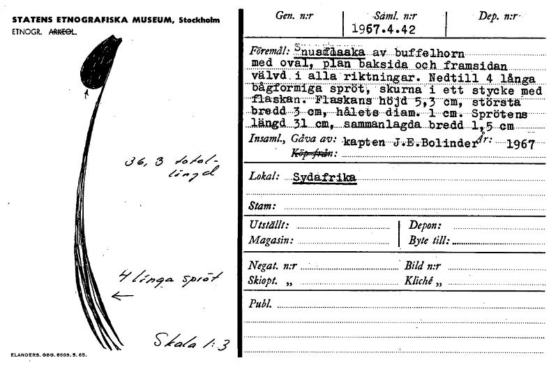 STATENS ETNOGRAFISKA MUSEUM, Stockholm ETNOGR. moget. (10, 3‘4,47- - 'z: ,57,,,-7,/ ELANDERS. 000.13505.5.65. Gen. n:r I .Sånd. n:r I 1967.4.42 I Dep. n:r. ~il: snushaaka av buffelhorn och framsidan N...