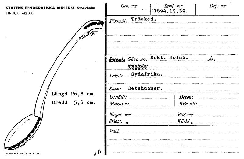 • År: Å Gåva av: Dokt. Holub 4411~3r Lokal: Sydafrika. STATENS ETNOGRAFISKA MUSEUM, Stockholm ETNOGR. ARKEOL. Gen. n:r • Samla n: r-s Dep. n:r -1894.15.39. Träsked. räsked. Stam: Betshuaner. Depon: Byt... Visa hela