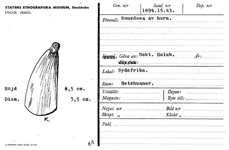 STATENS ETNOGRAFISKA MUSEUM, Stockholm ETNOGR. ARKEOL. Gen. n:r Saml. n:r I Dep. n:r 1894.15.43. Föremål: Snusdosa av horn. 4Kale36, Gåva av: Dokt. Holub. ASkyarzdk: Höjd Diam. 9,5 cm. 3,5 cm. År: Lok...