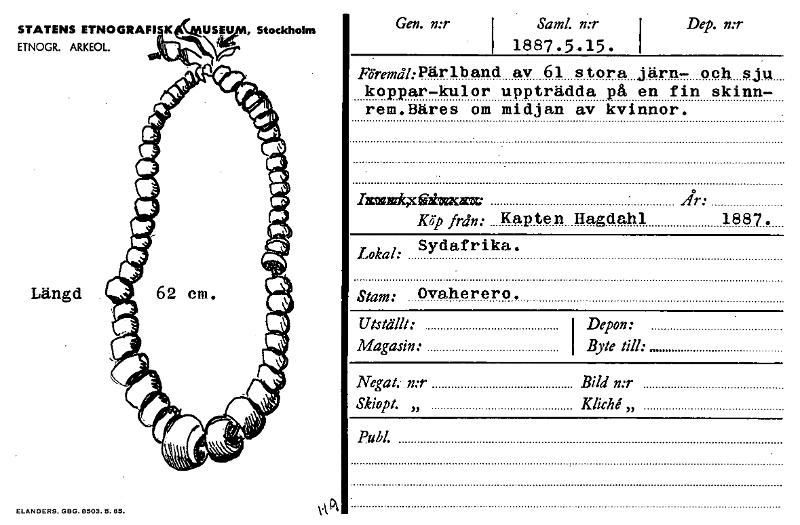 • STATENS ETNOGRAFI K US U , Stockholm ETNOGR. ARKEOL. Längd Gen. n:rI I Saml. n:r Dep. n:r I 1887.5.15. Föremål: pärlband av 61 stora järn— och sju koppar—kulor uppträdda på en fin skinn- rem.Bäres om... Visa hela