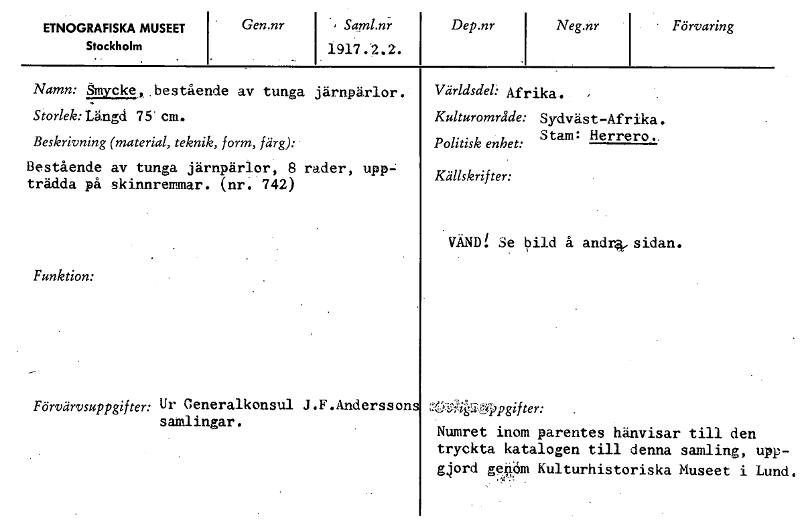 ETNOGRAFISKA MUSEET Stockholm Gen.nr Saml.nr 1917.2.2. Dep.nr Neg.nr • Förvaring Namn: Smycke, bestående av tunga järnpärlor. Storlek: Längd 75. cm. Beskrivning (material, teknik, form, färg): Bestående av tunga järnpärlor, 8 rader, upp trädda på skinnremmar. (nr. 742) Världsdel: Afrika. Kulturområde: Sydväst-Afrika. Politisk enhet: Stam: Herrero. Källskrifter: VÄND/. Se "bild å andrge sidan. Funktion: pgifter: Numret inom parentes hänvisar till den tryckta katalogen till denna samling, upp- gjord genöm Kulturhistoriska Museet i Lund. Förvärvsuppgifter: Ur Generalkonsul J.F.Anderssons samlingar. [ocr]