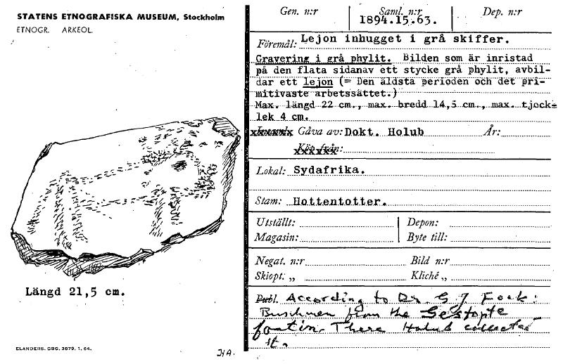 • STATENS ETNOGRAFISKA MUSEUM, Stockholm ETNOGR. ARKEOL. Längd 21,5 cm. ELANDERS.GE16.3879.1.64. J/A. Gen. mr Sand. n:r 1894.15:63 . I Dep. n:r Föremål: Lejon inhugget - • Gravering _i grå phylit. i grå... Visa hela