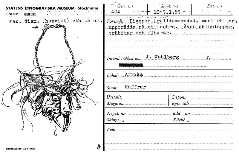 STATENS ETNOGRAFISKA MUSEUM, Stockholm ETNOGR. mura _ , • • - - - - Max. diam. (hopvikt) c't-a 18 cm-. - ' Gen. n:r - Saml: .72:r Dep. n:r 404 . .., _ _., - 1845:16.5 - -- _ .. . - Fören:al:. :T.Div.erse_troIldomsmedel mest rötter, Uppträdda. på .ett snöre. Även skinnlappar., träbitar och fjädrar. Insaml., Gåva av. J. Wahlberg År. ffiMM¥MWER Utställt: Magasin: Depon.: Byte till: Negat. n:r Bild n:r Skiopt. „ Kliche „ Publ. Lokal: Afrika Stam: Kaffrer BOKTRYCKERI AB THULE [ocr]
