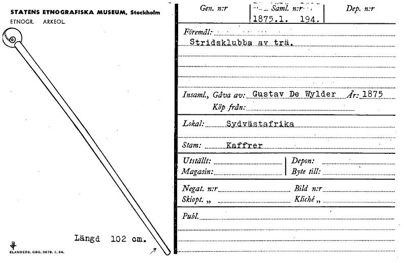 STATENS ETNOGRAFISKA MUSEUM, Stockholm ETNOGR. ARKEOL. ELANDERS.GBG.3879.1.64. Gen. n:rI-.. __ SamL n:r- - , 11875.1. 194. I Dep. n:r i Föremål: - ' • - • . - Strislaklubba av trä. Insaml, Gåva av: Gustav De Velder yr: 1875 Köp från: Lokal: Sydvastafrika Stam: Kaffrez Utställt: Magasin: I Depon: , Byte till: Negat. n:r Bild n:r Skiopt. „ Klich6 „ , PubL [ocr]