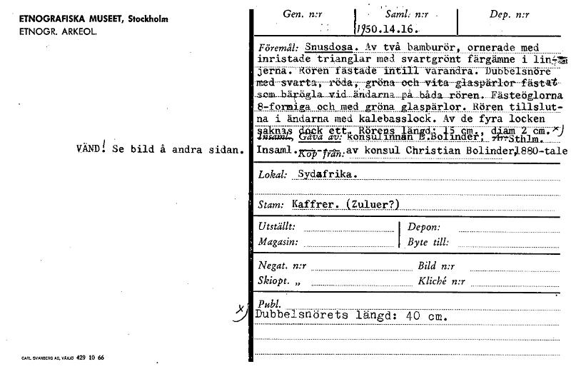 ETNOGRAFISKA MUSEET, Stockholm ETNOGR. ARKEOL. VÄND! Se bild å andra sidan. CARL SVANBERG AR. VÄXJÖ 429 10 66 Gen. n:r ,. I ' Saml; n:r . PY50.14.16, Dep. n:r . Föremål: Snusdosa. inristade trianglar .jerna..Roren fastade le-Id—svarta, röda, 8-formiga och med na i ändarna med Iiknas dn'ek ett gsam4, (Java av:konsulinnan ..som_bäxtägla g.id....ändaxna....på_båd.a....rören....Fästeöglorni Av två bamburör, ornerade med med svartgrönt färgämne i linl intill varandra. Dubbelsnore grörta-och-vita-glaspärlor-fästat- gröna glaspärlor. Rören tillslut- kalebasslock. Av de fyra locken Rörens längd. 3 cm d'am 2 cm.x' .Bo indef; .S.thlm..._ - konsul Christian BolinderP80-tal Insaml.ro-pruvav Lokal: Sydafrika. Stam: Kaffrer. (Zuluer?) Utställt: Magasin: j I Depon: ,Byte till: Negat. n:r Bild n:r Skiopt. „ Klicht, n:r Publ. Dubbelsnörets längd: 40 cm. [ocr]