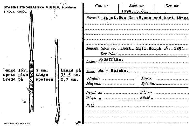 Gen. mrj Sand. n:r I Dep. n:r I .‘ 1894.15.61... Fölpmdh Spjut,Som Nr 48,men mod_kort tånge titzmik Gåva av: ....D.okt. Emil Holup ifer: .1894 Köp från: STATENS ETNOGRAFISKA MUSEUM, Stockholm ETNOGR...