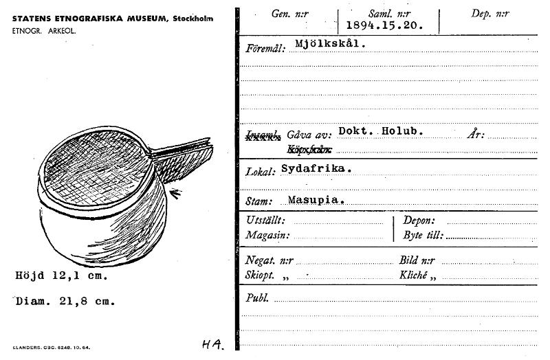 • STATENS ETNOGRAFISKA MUSEUM, Stockholm ETNOGR. ARKEOL. Gen. n:r • Saml. n:r 18911.15.20. Dep. n:r Höjd 12,1 cm. Diam. 21,8 cm. Föremål: Mjölkskål. Åniäl Gåva av: Dokt. Holub. Kriipxfitzikne År: Lokal... Visa hela