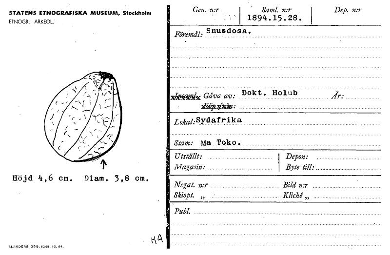 • Gen. n:r STATENS ETNOGRAEJSKA MUSEUM, Stockholm ETNOGR. ARKEOL. Saml. n:r 1894.15.28. Dep. n:r Förmal: Snusdosa. Dokt. Holub xIjätaisix Gåva av: 21i.2.11£2firdo: Lokal:Sydafrika Stam: Ma Toko. Utställ... Visa hela