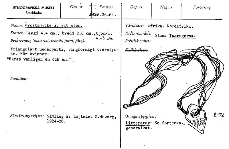 ETNOGRAFISKA MUSEET Stockholm Gen.nr Saml.nr 926.26.64. Dep.nr Neg.nr Förvaring Namn: Bröstsmycke av vit sten. Storlek: Längd 4,4 cm., bredd 2,6 cm..,tjockl. ttn, Beskrivning (material, teknik, form, färg): Triangulärt underparti, ringformigt överstyc- ke. För kvinnor. "Bäras vanligen en och en.", Funktion: Förvärvsuppgifter: Samling av Löjtnant G.Moberg, 1924-26. Världsdel: Afrika. Nordafrika. Kulturområde: Stam: Tuareperna. Politisk enhet: Källskrifter: Övriga uppgifter: Litteratur: Se förteckn.i generalkat. [ocr]