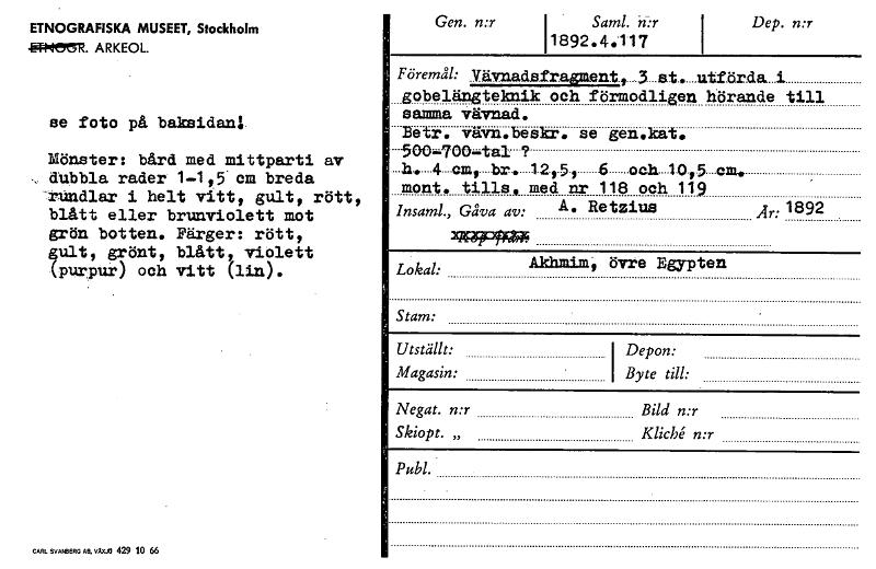 ETNOGRAFISKA MUSEET, Stockholm ~GR. ARKEOL. Gen. n:r Saml. -n-:r Dep. n:r 1892.4.117 Föremål: YINnadsfragment, 3 st. _utförda. i gobelängteknik och förmodligen hörande till samma vävnad. Betr. vävn.beskr. se gen.kat. 500-700-tal 14 4-am, br. 12T5, 8 och. 10,5 0114 mont. tills, med nr 118 och 119 Insaml., Gåva av: A. Retziva Ar: 1892 ~PM Lokal: Akhmim, övre Egypten Stam: Utställt: Depon: Magasin: I Byte till: Negat. n:r Bild n:r Skiopt. „ Kliché n:r Publ. se foto på baksidanå Mönster: bård med mittparti av dubbla rader 1-1,5 cm breda 'rundlar i helt vitt, gult, rött, blått eller brunviolett mot grön botten. Färger: rött, gult, grönt, blått, violett (purpur) och vitt (lin). CARL SVANBERG AD. VAX10 429 10 66 [ocr]