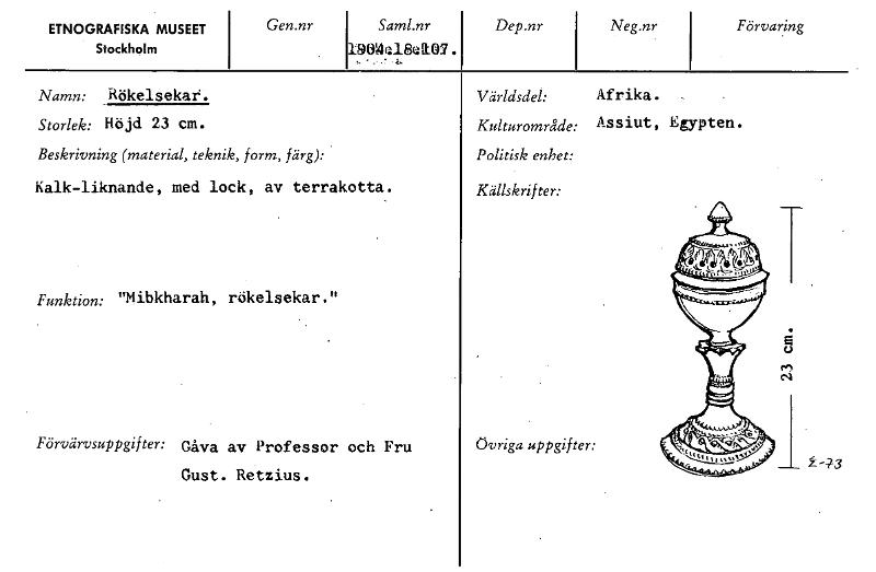 ETNOGRAFISKA MUSEET Stockholm Gen.nr Saml.nr 190'418(2107. Dep.nr Neg.nr Förvaring Namn: Rökelsekar. Storlek: Höjd 23 cm. Beskrivning (material, teknik, form, färg): Kalk-liknande, med lock, av terrakotta. Världsdel: Afrika. Kulturområde: Assiut, Egypten. Politisk enhet: Källskrifter: Funktion: "Mibkharah, rökelsekar." Förvärvsuppgifter: Gåva av Professor och Fru Gust. Retzius. Övriga uppgifter: ±--73 [ocr]