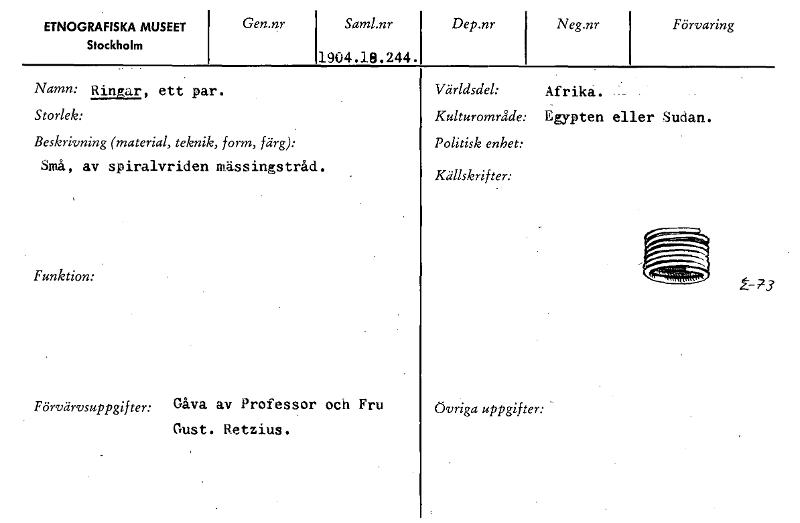 ETNOGRAFISKA MUSEET Stockholm Gen.nr Saml.nr 1904.18.244. Dep.nr Neg.nr Förvaring Namn: Ringar, ett par. Storlek: Beskrivning (material, teknik, form, färg): Små, av spiralvriden mässingstråd. Funktion: Världsdel: Afrika. Kulturområde: Egypten eller Sudan. Politisk enhet: Källskrifter: Övriga uppgifter: Förvärvsuppgif ter: Gåva av Professor och Fru Gust. Retzius. ±-73 [ocr]