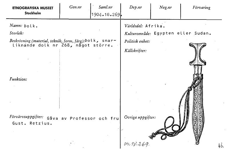 Gen.nr ETNOGRAFISKA MUSEET Stockholm Saml.nr Dep.nr 1904.18.269 Neg.nr Förvaring Namn: Dolk. Storlek: Beskrivning (material, teknik, form, färg):Dolk, snar— liknande dolk nr 268, något större. Funktion: Förvärvsuppgif ter: Gåva av Professor och fru Gust. Retzius. Världsdel: Afrika.. Kulturområde: Politisk enhet: Källskrifter: Egypten eller Sudan. Övriga uppgifter: 7Y..16 9. [ocr]