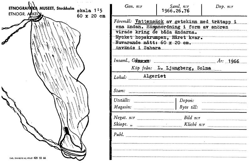 ETNOGRAF MUSEET, Stockholm skala 1 :5 ETNOGR. 60 x 20 cm Gen. n:r 94a.% .n-g Dep. n:r CARL SVANBERG AB, VÄXJÖ 429 10 66 Föremål: Vattenstick av getskinn med trätapp ena ändan. Här94nordning i form av snören virade kring ge båda ändarna. -My-cke-t- hopskrumpen, Håret kvar. --Nuvarande-måtts -60- x 20 em-. Anviltula i Sahara Insaml., Con: År: 19.66.......... Köp från: L. Ljungberg. Solna Lokal: Algeriet Stam: Utställt: I Depon: Magasin: Byte till: Negat. n:r Bild n:r Skiopt. „ KlicH n:r Publ. [ocr]Stäng