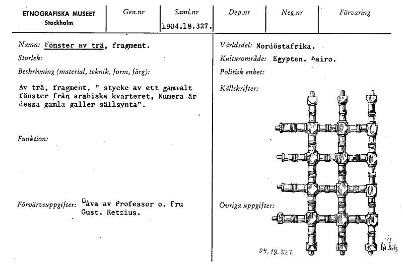 • ETNOGRAFISKA MUSEET Stockholm Gen.nr Saml.nr 1904.18.327. Dep.nr Neg.nr Förvaring Namn: Fönster av trä, fragment. Storlek: Beskrivning (material, teknik, form, färg): Av trå, fragment, " stycke av ett... Visa hela