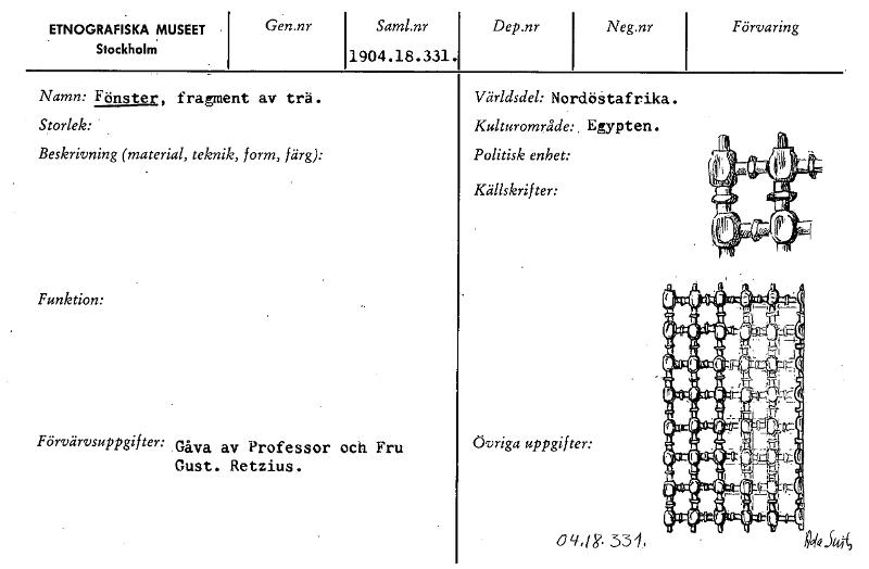ETNOGRAFISKA MUSEET Stockholm' Gen.nr Saml.nr 1904.18.331. Dep.nr Neg.nr Förvaring Aranm Fönster, fragment av trä. Storlek: Beskrivning (material, teknik, form, färg): Funktion: Förvärvsuppgifter: Gåva av Professor och Fru Gust. Retzius. Världsdel: NordöStafrika. Kulturområde:. Egypten . Politisk enhet: Källskrifter: Övriga uppgifter: ©1147.331, Ofilik(9 [ocr]