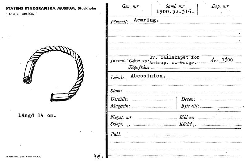• Gen. n:r STATENS ETNOGRAFISKA MUSEUM, Stockholm ETNOGR. ~Ä. Saml. n:r 1900 .32.316 . Dep. n:r Längd 14 em. Armring Sv. Sällskapet for Insaml.,. Gåva av.'Antro.p G pgröpcArinx . o. eogr. År; 1900 Ut... Visa hela