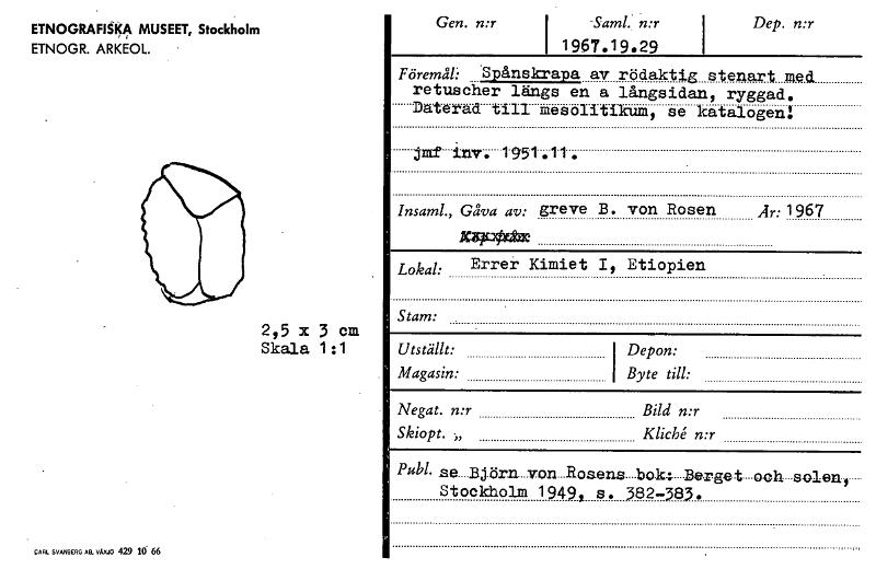 ETNOGRAFISKA MUSEET, Stockholm ETNOGR. ARKEOL. Gen. n:ri I -Saml. n:r Dep. n:r I 1967.19.29 Föremål: Spånskrapa av rödaktig stenart med retuscher längs en a långsidan, ryggad. Daterad till mesolitikum, se katalogen! 2,5 x 3 cm Skala 1:1 Smf inv. 1951.11. Insaml., Gåva av: greve B. von Rosen År: 1967 Lokal: Errer Kimiet 1, Etiopien Stam: Utställt: Depon: Magasin: I Byte till: Negat. n:r Bild n:r Skiopt. ,, Kliché» n:r Pm5/.2e_Bjönn_von_Rosens-bok4-Berget-ooh-soleni. _- Stockholm 1949, s. 382-58.5. CARL SVANBERG AB, VÄXJÖ 429 10 66 [ocr]