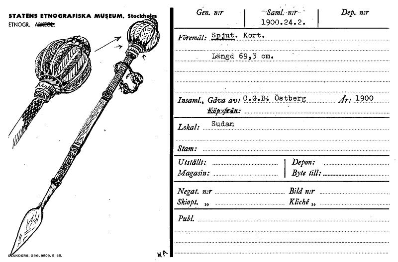 • STATENS ETNOGRAFISKA MUSEUM, Stockholm ETNOGR. Aiti~ Gen. n:r Dep. n:r 1900.24.2. Föremål: Spjut. Kort. Längd 69,3 cm. Insaml, Gåva av: a • G•B: Östberg År: 1900 £141396tzik: Lokal: Sudan Stam: Uts... Visa hela