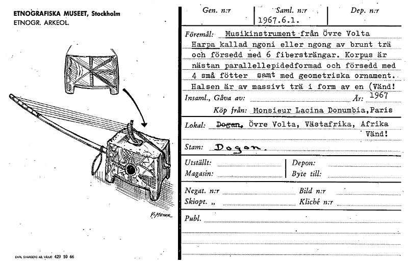 ETNOGRAFISKA MUSEET, Stockholm ETNOGR. ARKEOL. • Gen. n:rI Saml. n:r 11967.6.1. Dep. n:r • Föremål: Musikinstrument från Övre Volta Harpa kallad ngoni eller ngong av brunt trä och försedd Med 6 fibe...