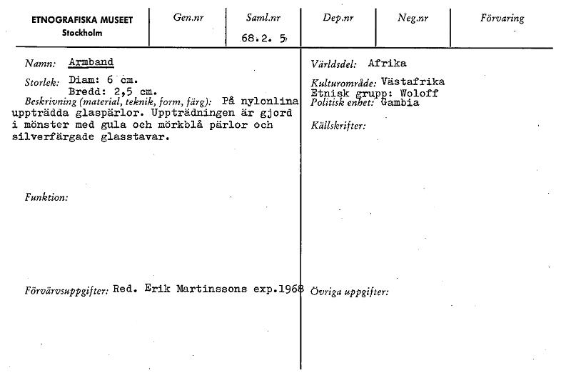 ETNOGRAFISKA MUSEET Stockholm Gen.nr Saml.nr .6.8 2. 5) Dep.nr Neg.nr Förvaring Namn: Armband Storlek: Diam: 6 cm. Bredd: 2,5 cm. Beskrivning (material, teknik, form, färg): På nylonlina uppträdda glaspärlor. Uppträdningen är gjord i mönster med gula och mörkblå pärlor och silverfärgade glasstavar. Funktion: Förvärvsuppgifter: Red. Erik Martinssons exp.196 Världsdel: Afrika Kulturområde: Väst afrika Etnisk grupp: Woloff Politisk enhet: Gambia Källskrifter: Övriga uppgifter: [ocr]Stäng