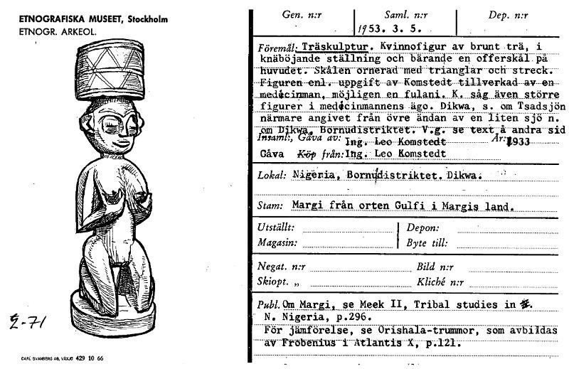ETNOGRAFISKA MUSEET, Stockholm ETNOGR. ARKEOL. CARL SVANBERG AB. VAX.10 429 10 66 Gen. n:r Saml. n:r .1/753. 3. 5. . Dep. n:r 1. . Föremål; Träskulptur. Kvinnofigur av brunt trä, i knäböjande ställning och bärande en offerskål på huvudet. Skålen ornerad med.trianglar och streck. Figuren enl. uppgift av Komst-edt tillverkad av en ....medådinman,...möjligen..en....fulani, ... .N......s:ag även större figurer i medicinmannens-ägo. Dikwa, s. åm Tsadsjö närmare angivet från övre ändan av en liten sjö n. omfDkwac, Bernudistrikut. V-4. setext-å-andra-si intamt:, Gava av: Inå. Leo-Kemstedt År19.33 Gåva Köp NW:Ihg:-Leo Komstedt , . . Lokal: Nigeria' Born4distriktet..Dikwa, Stam: Margi från orten Gulfi i Margis land, Utställt: Magasin: I Depon: • I Byte till: Negat. n:r Bild n:r Skiopt. „ KlicIA n:r Publ. Om Margi, se Meek II, Tribal studies in it. - N. Nigeria, p.296. För jämförelse, se Orishala-trummor, som avbildas av Ftobenius-i Atlantis X, p.121. n d [ocr]