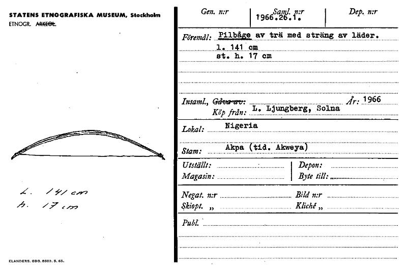 Gen. n:r 1966s.a2m6i3;:r Dep.. n:r STATENS ETNOGRAFISKA MUSEUM, Stockholm ETNOGR. Ikkget. Föremål: pilbke, av trä med sträng av läder. 1. 141 cm st. h. 17 cm Insaml., Grier~ År: 1966Köp frän: L. Lju...