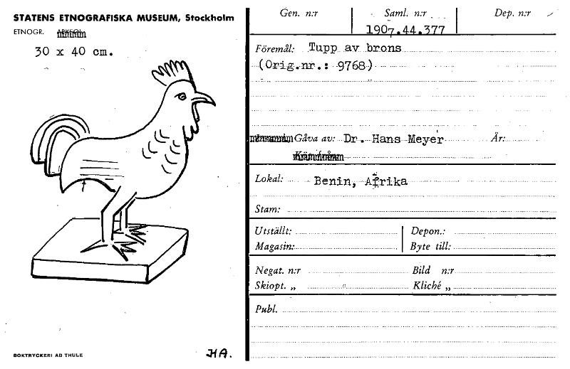 • STATENS ETNOGRAFISKA MUSEUM, Stockholm ETNOGR. tätän 30 X 40 CM. Dep. n:r öen. n:r -. Saml.: n:r _ I 1907.4-4.377 i Fömmål: _Tupp_av_brons .(Orig.nt.: -9768). in~iviGåva av: Dr . Hans Meyeir År. ifien... Visa hela