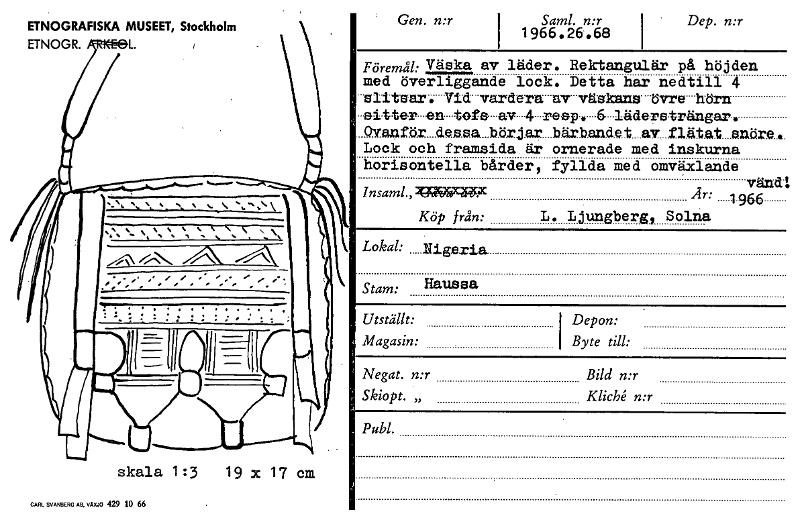 .... .... - . ; : ; • ETNOGRAFISKA MUSEET, Stockholm ETNOGR. L. \ skala 1:3 19 x 17 cm CARL SVANBERG AB, VÅM° 429 10 66 Gen. n:r Saml. n:r 1966.26.68 i Dep. n:r Föremål: Väska av läder. Rektangulär p...Visa hela