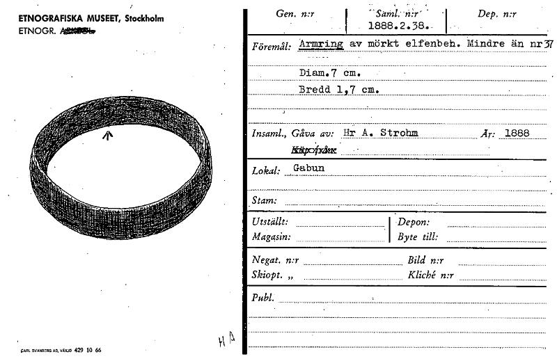 • ETNOGRAFISKA MUSEET, Stockholm ETNOGR. Aden.1949r Gen. n:r Saml. n:r' 1888.2.38.- Dep. n:r Förmak Armring av mörkt elfenbeh. Mindre än nr37 Diam.7 cm. Bredd 1,7 cm. Insaml., Gåva av: ~Nå= Hr A. Strohm... Visa hela