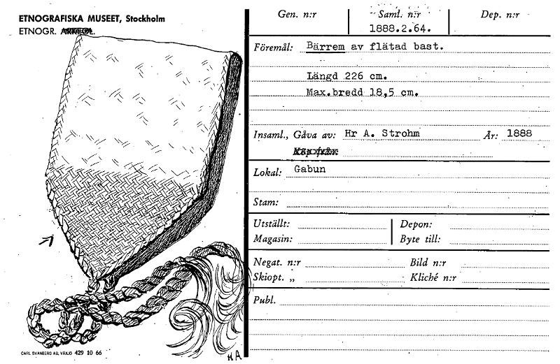 • ETNOGRAFISKA MUSEET, Stockholm Gen. n:r rz:r Dep. n:r _ ETNOGR. 1888.2.64. Föremål: Bärrem av flätad bast. Längd .226 cm. Max...bredd...1845 cm, Insaml., Gåva av: Hr A. Strohm. Är: 1888 Lokal: Gabun S... Visa hela