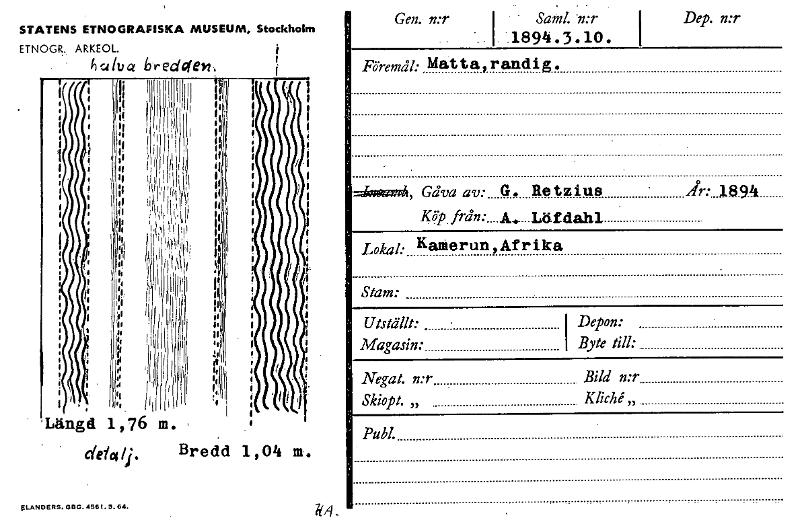 • STATENS ETNOGRAFISKA MUSEUM, Stockholm ETNOGR. ARKEOL. halva breelCfem . de« Bredd 1, 04 m. Gen. n:r Sand. n:r I 1894.3.10 . Dep. n:r Föremål: Matta, randig. G. Retzius ' Köpfrån:._A...".Löfdahl A.18... Visa hela