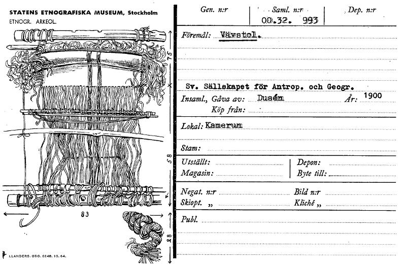 Gen. n:r - Saml. n:r• ,Dep. n:r 00)..32. 9 I33 År: 1900 Insaml., Gåva av: Dus& Föremål: Vävstol« Sv. Sällskapet för Artrop. och Geogr. Köp från: Lokal: Kame= Stam: Utställt: Depon: Magasin: Byte...