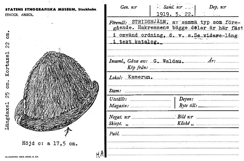 STATENS ETNOGRAFISKA MUSEUM, Stockholm ETNOGR. ARKEOL. Längdaxel 25 cm. Kortaxel 22 cm. Höjd c: a 17,5 cm. Gen. n:r- Said. n:r „ I Dep. n:r I 1919. 5 . 22„ Insatta., Gåva av: ..G.....Waldau. År: Köp från: Föremål: STRIDSHJÄLM; av samme, -typ gående. Hakremmens bägge_delar-är-här fäst i omvänd ordning., d, y.. s...Se_miåalke,1ång. Lokal: Kamerun, Stam: Utställt: I Depon: Magasin: Byte till: Negat. n:r « Bild n:r Skiopt. „ Kliche „ Publ. ELANDERS. 0130. 5505. 5. 65. h K [ocr]