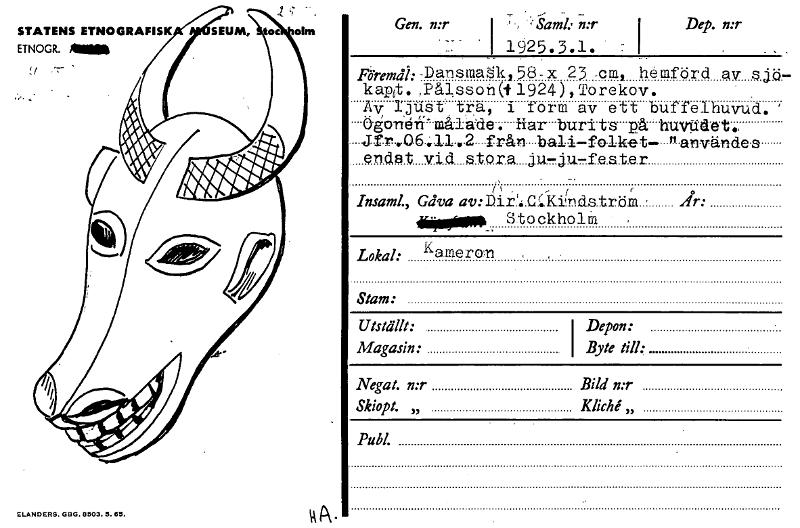 ELAND ERS. G BG. 5503. 5. 85. k A. Gen. n:r __ . - I ':51v71r 1925.3.1. Dep.mr i . Fåmmih-DansmaU258-x 23 .cm, hemförd av sjö: kapM.,Pålssoil(f1924),Torekov. , Av IjUst tra, i form av ett buffelhuvud...