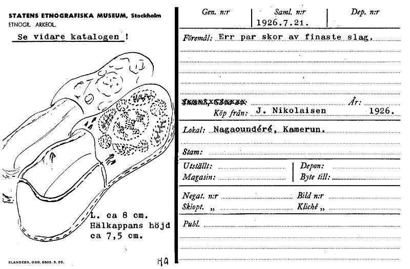 Gen. n:r I Saml. n:r I 1926.7.21. Dep. n:r Föremål: Err par skor av finaste slag. STATENS ETNOGRAFISKA MUSEUM, Stockholm ETNOGR. ARKEOL. Se vidare katalogen! • .,, 47/1",if, ..11.1•;$7:;.;271.9 Pis?"x2K2tifegink 1926. Köp från: J. Nikolaisen Lokal: Nagaound6.4, Kamerun* Stam: Negat. n:r Bild n:r Skiopt. „ Klichl „ lF . ca 8 cm. Hälkappans höjd Publ. ca 7,5 cm. ELANDER9. GB0.8509.5.85. h [ocr]