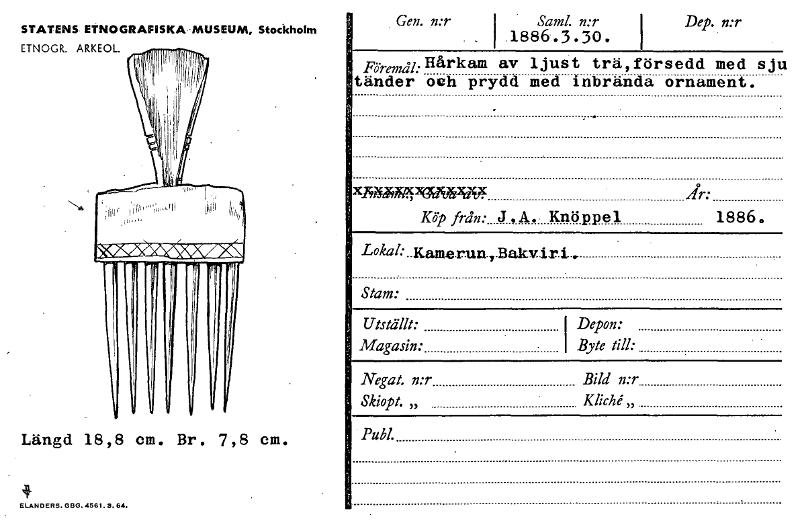 STATENS ETNOGRAFISKA MUSEUM, Stockholm ETNOGR. ARKEOL. j41 Längd 18,8 cm. Br. 7,8 cm. ELANDERS. G85.4561.3. 64. Gen. n:r Saml. n:r .1886.3.30. Dep. n:r R5..eno:Hårkam av ljust trätförsedd med sjt tänder och prydd med inbrända ornament. . .. 2c.194~~rOF År: Köp från: J,A.• Knäppel 1886. Lokal: ..KameruarBakvir i- Stam: Utställt: Magasin: • • I Depon: I Byte till: . Negat. n:r Bild n:r Skiopt. „ Kliché,, Publ. [ocr]