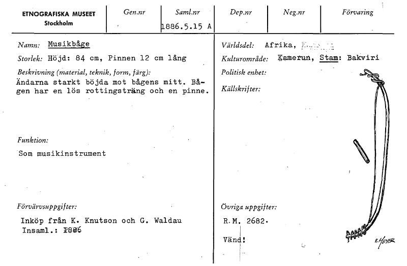 ETNOGRAFISKA MUSEET Stockholm Gen.nr Saml.nr 886.5.15 A Dep.nr Neg.nr Förvaring Namn: Musikbåge Storlek: Höjd: 84 cm, Pinnen 12 cm lång Beskrivning (material, teknik, form, färg): Ändarna starkt böjda mot bågens mitt. Bå- gen har en lös rottingsträng och en pinne. Funktion: Som musikinstrument Förvärvsuppgifter: Inköp från K. Knutson och G. Waldau Insaml.: 18'06 Världsdel: Afrika, övriga uppgifter: R. M. 2682. Politisk enhet: Källskrifter: Kulturområde: Vänd: Kamerun, Stam: Bakviri Musikbågen är belagd hos Banyang (Baessler Archiv p. 105 Karta 33). Musikbåge BaNjangi ill. Baessler Archiv, Band 8, p. 64, fig. 83. F [ocr]