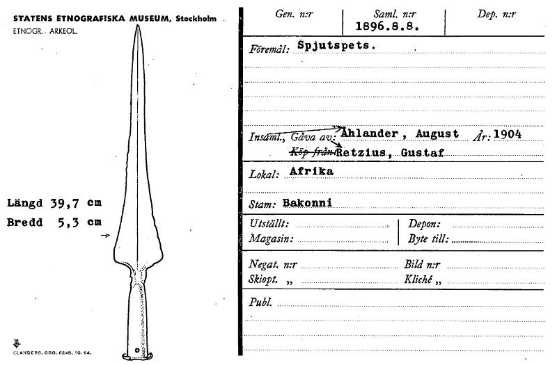STATENS ETNOGRAFISKA MUSEUM, Stockholm ETNOGR., ARKEOL. Gen. n:r Sand. n:r 1896.8.8. Dep. n:r Föremål: Spjutspets. Insam ., Gåva av landet August jr:1904 4rröi)--firjwItetz.ins., Gustaf Lokal: Afr...