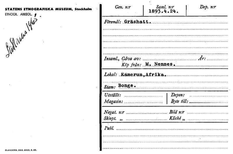 • Dep. mr STATENS ETNOGRAFISKA MUSEUM, Stockholm ETNOGR. ARKEOL. i Gen. n:r I Saml. n:r 1893 .4 .24 . Föremål: Gräshat t Insaml., Gåva av: Köp från: M, Nennes, Lokal: litimeruntAfrika. Stam: Bonge. Uts... Visa hela
