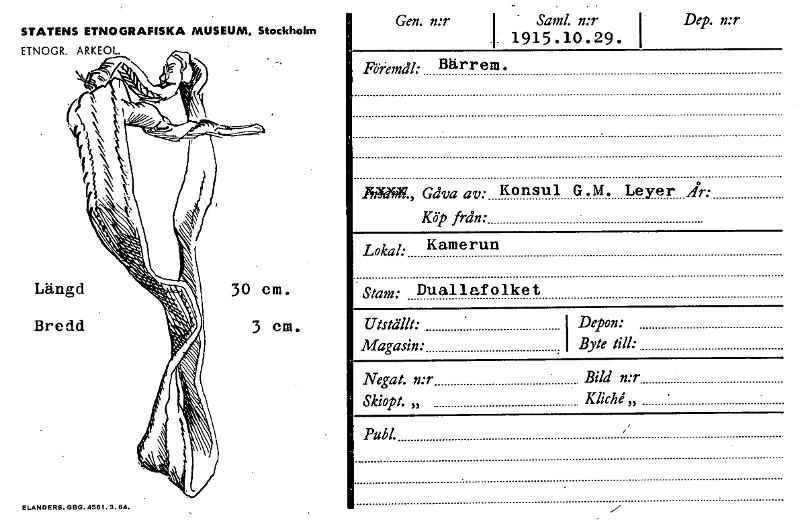 • STATENS ETNOGRAFISKA MUSEUM, Stockholm ETNOGR. ARKEOL. ztk, Längd -s-z-Nk%_ • 30 cm. Bredd 3 cm. ,sN\ ELANDERS. GBG. 4581. 3. 64. Gen. n:r - Saml. n:r 11915.10.29. Dep. n:r Föremål: Bärrem. IfJärulf ... Visa hela