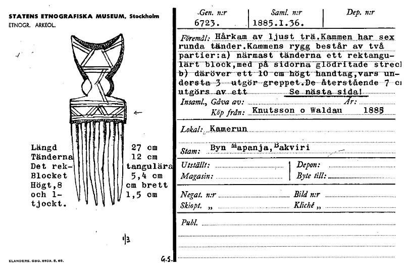 STATENS ETNOGRAFISKA MUSEUM, Stockholm ETNOGR. ARKEOL. .1 Längd Tändern Det rek- Blocket Högt,8 och 1- tjockt. ELANDERS. GBG. 8503. B. 65. 27 cm 12 cm tangulära 5,4 cm cm brett 1,5 em 4.5. ..Gen. n:r Sand. n:rDep. n:r 6723. I 1885.1.36. Föremål: Hårkam av ljust trä.Kammen har sex runda tänder.Kammens rygg består av två partier:a) närmast tänderna ett rektangu- iårt-block,med på sidorna giödritade strec] b)-däräver-ett 10 'cm-högt-handtag";vars" un- dersta-5 utgör greppet.De återstående 7 c] utgörs_av_ett Se .nästa-sidal Insaml., Gåva av: Ar: Köp från: Knutsson o Waldau 1885 Lokal: Kamerun Stam: Byn mapanjall3akviri Utställt: I Depon: Magasin: Byte till: Negat. n:r Bild n:r Skiopt. „ Klich6 „ Publ. [ocr]