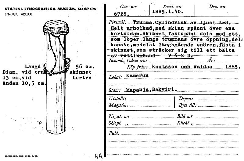 Gen. n:r 6728. SamL n:r Dep. n:r I1885.1.40. STATENS ETNOGRAFISKA MUSEUM, Stockholm ETNOGR. ARKEOL ELANDERS. GBG. 8503.5. 85. Längd Diam. vid tru 13 cm,vid ändan 10,5 cm 56 cm. skinnet bortre Fömmi 1:...