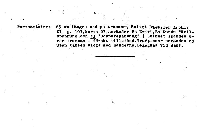 • Fortsättning: .23 cm längre ned på trumman( Enligt Bgwessler Archiv XI, p. 103,karta 23,använder Ba Kwiri,Ba Kundu "Keil- spannung och el "Schnurspannung".) Skinnet spändes ö- ver trumman i färskt til... Visa hela