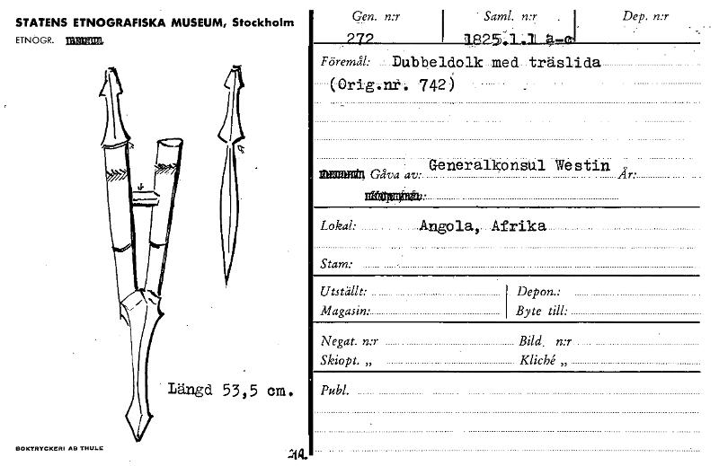 • STATENS ETNOGRAFISKA MUSEUM, Stockholm ETNOGR. Mann, Gen. n:r Samt. n:r 272 ile25£.1L~ Föremål: .Dubbeldolk..med. träslida (Orig.nt:. 742) Dep. n:r Generalkonsul Westin 0 INDRIFfig Gåva av: . ........ Visa hela