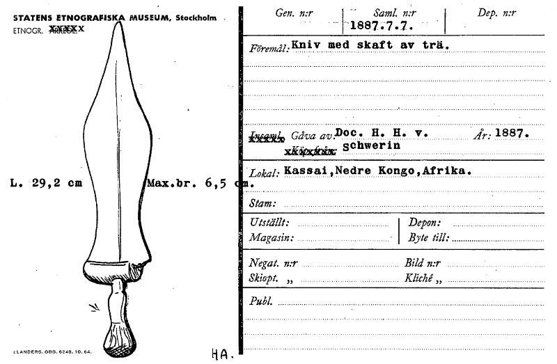 • jr: 1887 „ isekt_42 Gåva av,Doc • H. H. v. xiiipxtrix sehwerin Saml. n:r -1887.7.7 Föremål: Kniv med skaft av trä. Lokal: Kass aiNedre Kongo ,Afrika. Stam: Utställt: I Depon: Magasin: Byte till: N... Visa hela