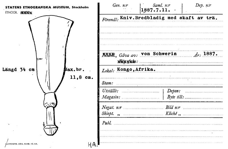 • El-ANDERS. GI30. 6248. 10. 64. År: 1887. Utställt: Magasin: Lokal: Kongo ,Afrika. Föremål:Kniv.Bredbladig med skaft av trä. Gåva av: von Schwerin Stam: Depon: Byte till: Negat. n:r Bild n:r Skiopt. ... Visa hela