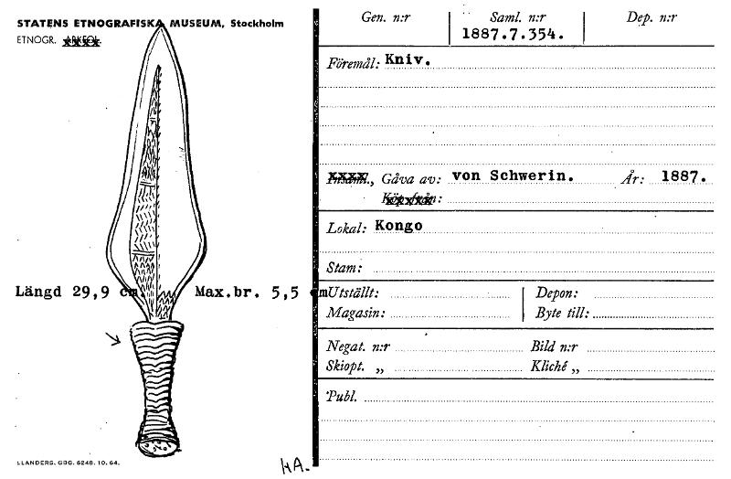 • Lokal: Kongo mUtställt: Magasin: Depon: I Byte till: Saml. n:r 1887.7.354. Föremål: Kniv • ANNIE, Gåva av: von Schwerin. Sbjexfitiv: Stam: Negat. n:r Bild n:r Skiopt. „ Klich6 „ Publ. Gen. n:r Är: ... Visa hela