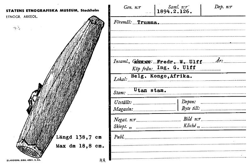 • STATENS ETNOGRAFISKA MUSEUM, Stockholm ETNOGR. ARKEOL Längd 138,7 em Max dm 18,8 cm. glANDERS. GBG. 4581. 9. 84. hR Gen. n:r i Saml. n:r- 1894.2.126. Dep. n:r Föremål: Trumma. ed...._. Ulf f År: Insa... Visa hela